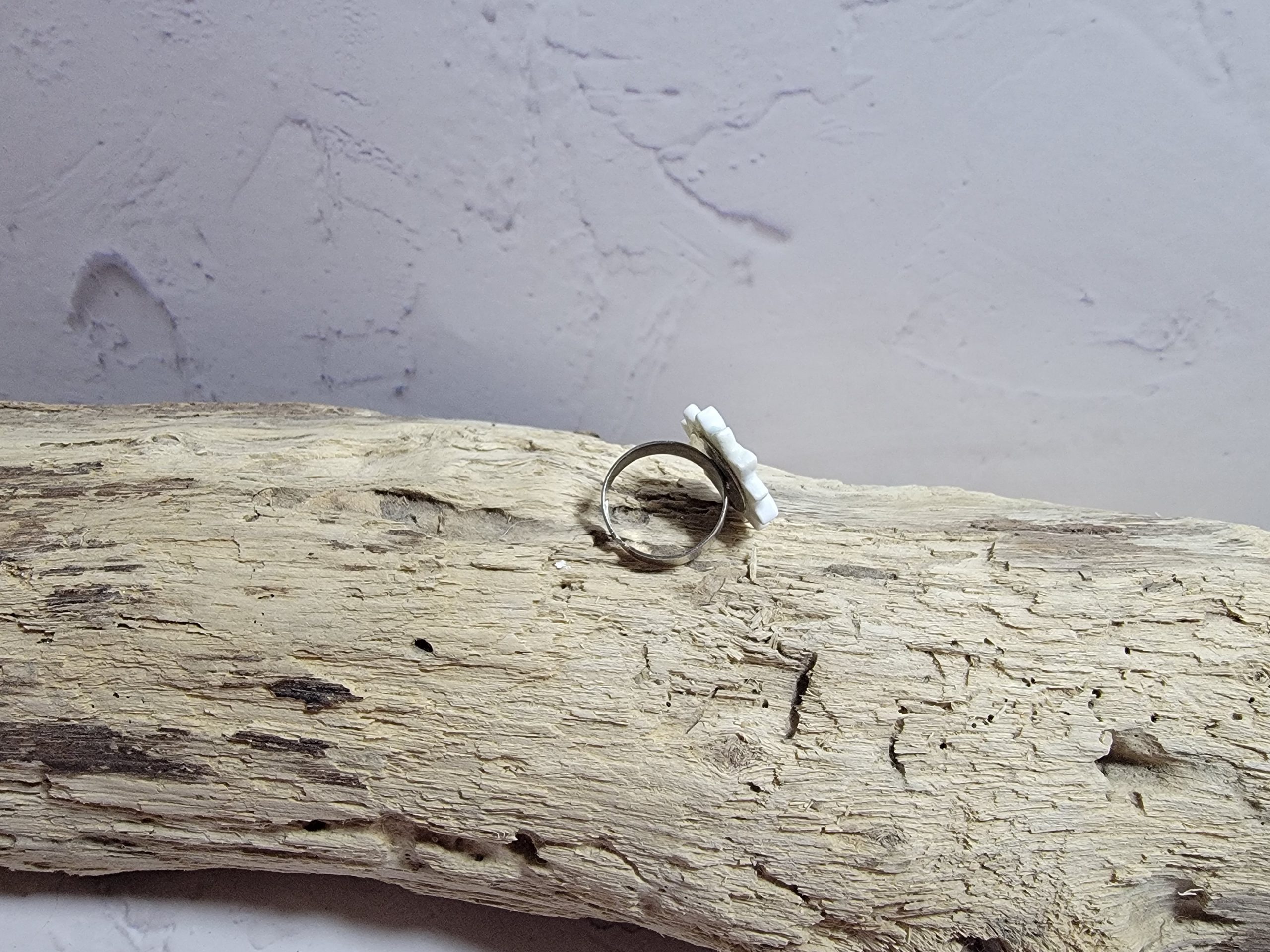Bague artisanale avec fleur en céramique, délicate et poétique. Un bijou fait main qui apporte une touche florale élégante à toutes vos tenues.