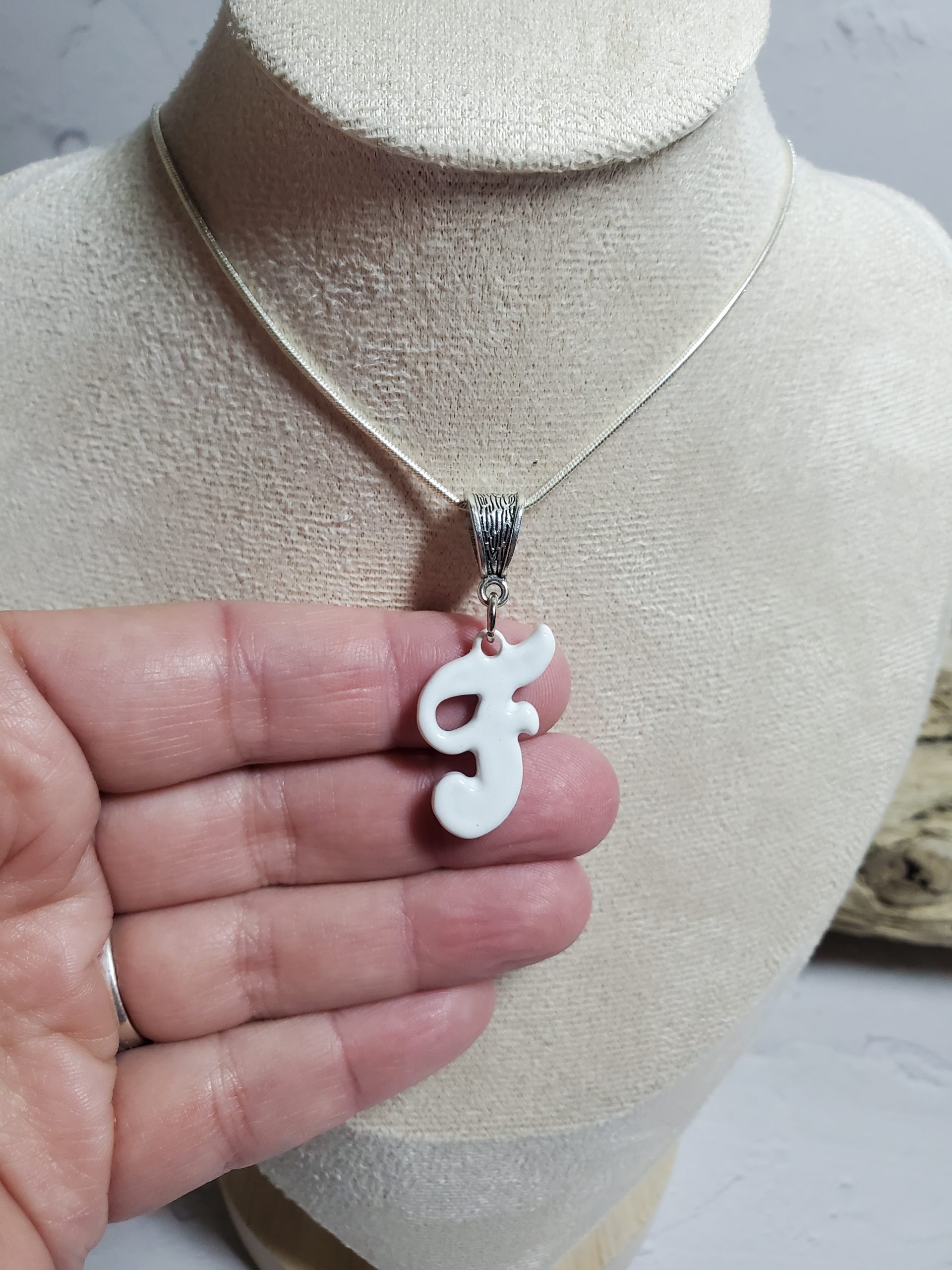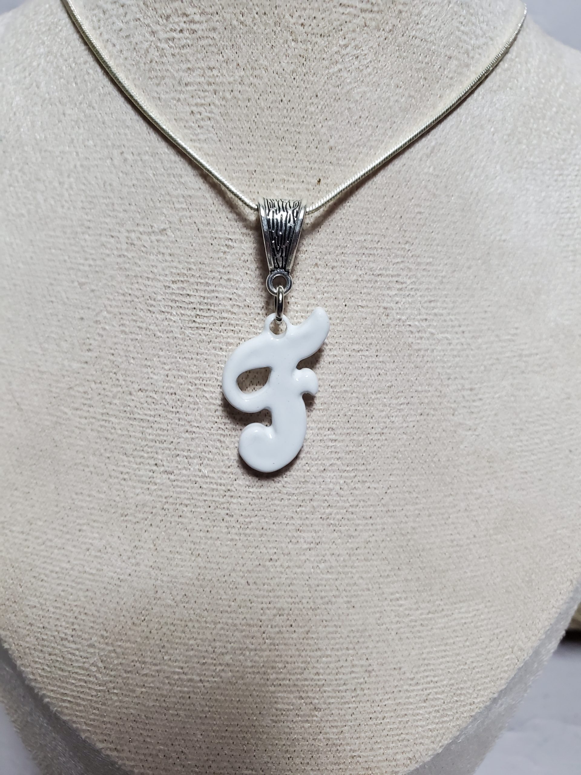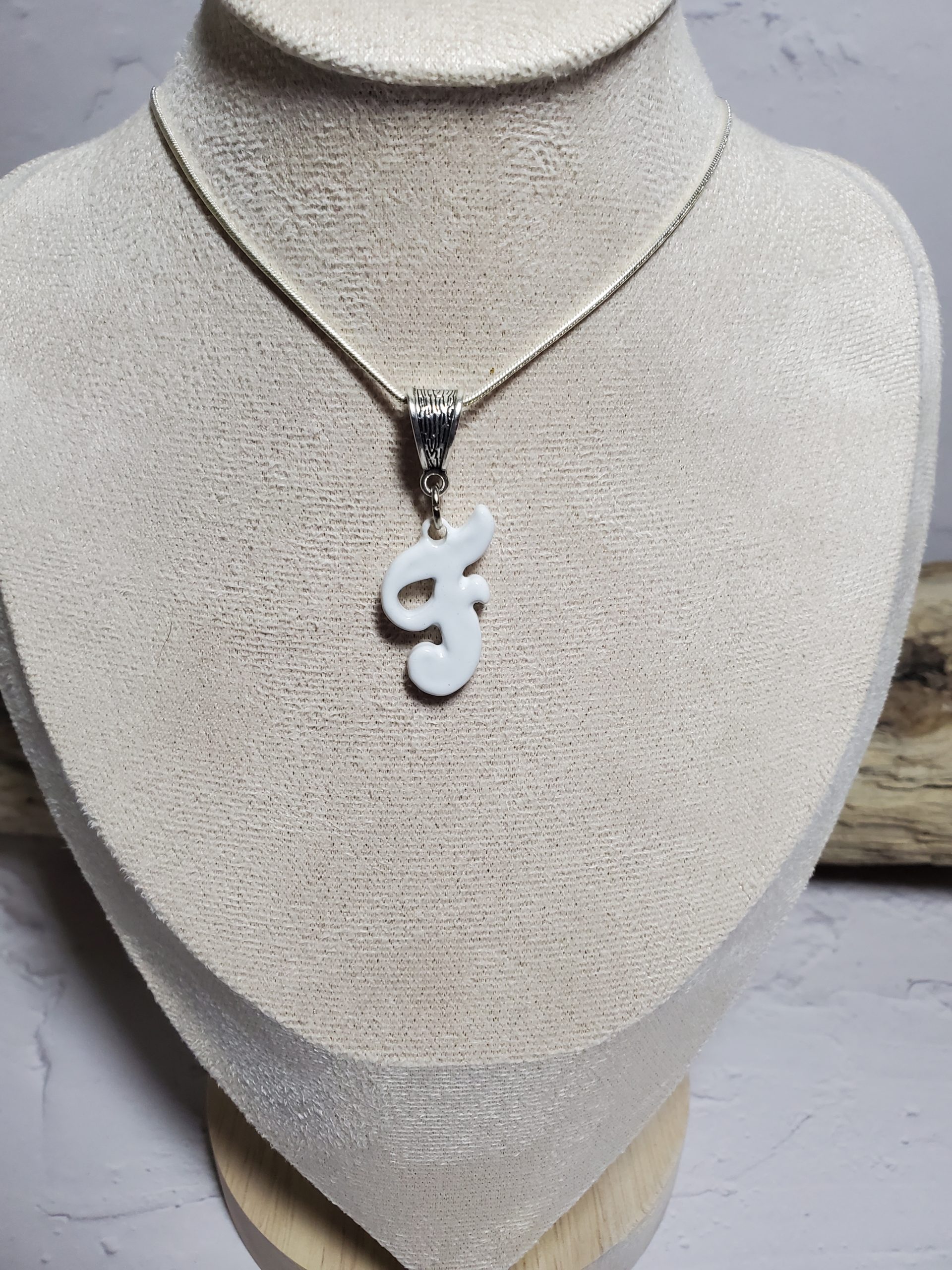 Pendentif en céramique en forme de lettre F. Bijou élégant et personnalisé pour une touche unique à votre style. Matériau durable et résistant. Parfait pour toutes occasions, du quotidien au cadeau original.